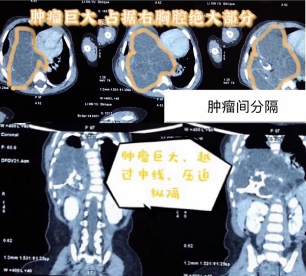 一周前,小彤彤因?yàn)闅獯?、呼吸困難、惡心在當(dāng)?shù)蒯t(yī)院就診,胸片檢查提示隔膨升可能,為了明確診斷來到哈爾濱市兒童醫(yī)院心胸外科就診。戚家峰副主任為孩子進(jìn)一步進(jìn)行查體考慮是縱隔腫瘤,通過胸部CT增強(qiáng)造影檢查更加清晰的看到腫瘤的特殊性,該腫瘤幾乎占滿右側(cè)胸腔,縱隔被擠壓后導(dǎo)致移位,心臟、食管均有不同程度的受壓影響。而且這個(gè)巨大的腫瘤由很多分隔組成,分隔中含有的物質(zhì)又不同,有囊性組織、實(shí)性組織和鈣化組織,考慮畸胎瘤可能。