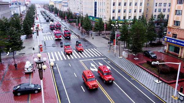 在漠河市城區(qū)主要街道,由防火指揮車、防火宣傳車、防火運兵車等33臺車輛組成的反思巡游車隊,長鳴防火警報,繞市區(qū)緩慢行駛,通過聲勢浩大的宣傳,警醒廣大居民群眾以史為鑒,深刻反思“五?六”火災帶來的慘痛教訓,讓森林防火時刻深入人心,嚴防森林火災發(fā)生。在漠河市區(qū)開展巡游活動的同時,各鎮(zhèn)也同步組織開展了規(guī)模不同的“五·六”反思警示教育活動。