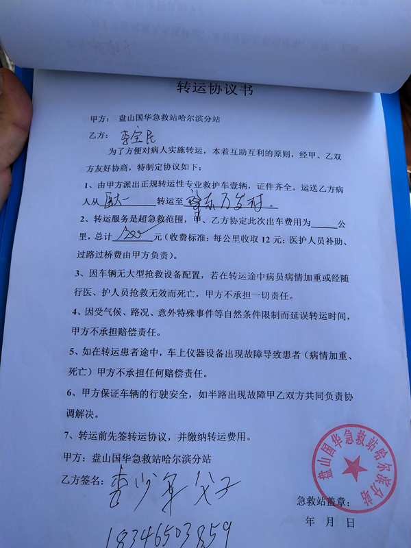 記者詢問了其中一名駕駛員車輛的相關(guān)手續(xù)和單位的資質(zhì),對(duì)方表示不清楚,他們只是司機(jī),負(fù)責(zé)開車,一個(gè)月工資3000元錢,公司指派去哪接人送到哪,他們就按照指示去做。記者又問到:你們是怎么收費(fèi)的?最遠(yuǎn)去到哪?車上有沒有醫(yī)護(hù)人員?對(duì)方說最遠(yuǎn)就是呼蘭,沒出過哈市,收費(fèi)就是按照公里數(shù)收費(fèi)。隨后工作人員在車?yán)镎业搅宿D(zhuǎn)運(yùn)協(xié)議書,其中一張顯示車輛從醫(yī)大一院轉(zhuǎn)運(yùn)至肇東市,收取費(fèi)用是1200元(收費(fèi)標(biāo)準(zhǔn):每公里收取12元,醫(yī)護(hù)人員補(bǔ)助、過路過橋費(fèi)由甲方負(fù)責(zé))。針對(duì)此情況,由于不確定車輛是否具備營(yíng)運(yùn)資質(zhì),需要和遼寧還有患者家屬方面核實(shí),所以將車輛的相關(guān)證件暫扣。