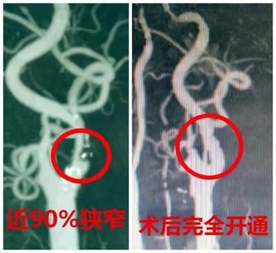 在神經(jīng)外一科醫(yī)護(hù)團(tuán)隊的精心管理及護(hù)理下,張大爺術(shù)后第二天即可下地活動,肢體反復(fù)癱瘓等癥狀消失,并且左眼視物不清的癥狀消失。復(fù)查頸部CTA檢查,左側(cè)頸內(nèi)動脈管徑完全恢復(fù)正常,避免了腦卒中發(fā)生的危險。