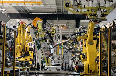 資料圖:江西上饒一家新能源電動汽車公司的智慧工廠內,機器人正同時作業(yè)?!±铐嵑?攝