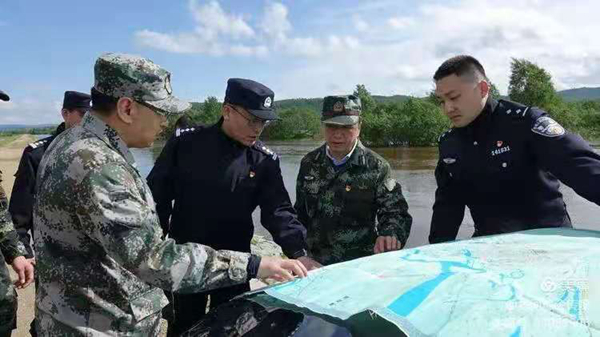 塔河林業(yè)局黨委書記許曉光、局長趙鐵軍同大興安嶺林業(yè)集團公司黨委書記于輝實地查看塔河污水處理廠西側的洪水引流現(xiàn)場