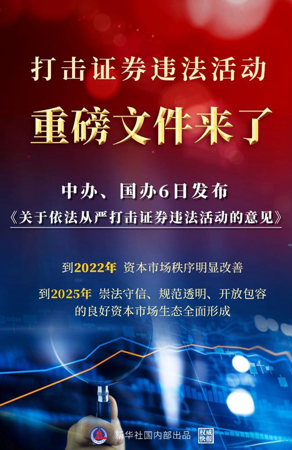 新華社北京7月6日電(記者張千千 劉慧)中共中央辦公廳、國(guó)務(wù)院辦公廳6日公開發(fā)布了《關(guān)于依法從嚴(yán)打擊證券違法活動(dòng)的意見》,對(duì)建立健全資本市場(chǎng)執(zhí)法司法體制機(jī)制、依法從嚴(yán)打擊證券違法活動(dòng)、推動(dòng)資本市場(chǎng)高質(zhì)量發(fā)展作出重要部署。