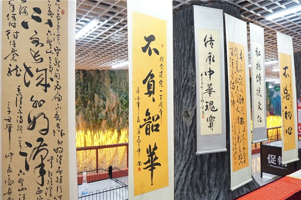 挽袖、研墨、調(diào)色、揮毫,書畫家們進(jìn)行現(xiàn)場(chǎng)書畫創(chuàng)作并交流創(chuàng)作心得。以書言志、以畫寄情,一幅幅極富感染力的書法、繪畫作品,抒發(fā)了對(duì)黨的敬愛之情和對(duì)祖國(guó)的美好祝愿?;顒?dòng)現(xiàn)場(chǎng)共展出書畫作品百余件。