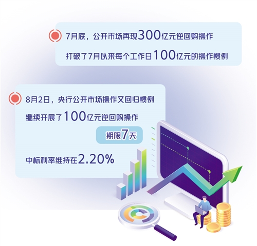7月底,公開市場(chǎng)再現(xiàn)300億元逆回購操作,打破了7月以來每個(gè)工作日100億元的操作慣例。7月29日、30日,中國人民銀行連續(xù)發(fā)公告稱,為維護(hù)月末流動(dòng)性平穩(wěn),以利率招標(biāo)方式開展了300億元逆回購操作,期限7天,中標(biāo)利率維持在2.20%不變。