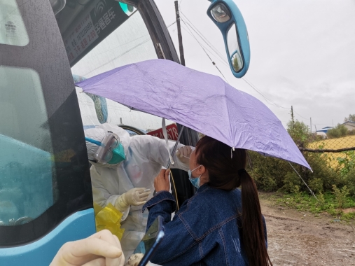 省醫(yī)院南崗院區(qū)中心手術(shù)室護(hù)士趙明裕,中秋節(jié)當(dāng)天下午正在家中給八歲的大女兒過生日,接到通知需要支援巴彥縣核酸采集,親了親身邊的大女兒和四歲的小女兒,立即驅(qū)車前往醫(yī)院。到達(dá)巴彥后,趙明裕被分到后山鄉(xiāng),三人小組同組另兩位隊(duì)員都是年過40歲的大姐,已經(jīng)是預(yù)備黨員的趙明裕想想自己年輕一定要多干些,主動(dòng)請(qǐng)纓承擔(dān)了更多的工作。當(dāng)天,三人共完成了五個(gè)村屯近600人的采集,外面陰雨綿綿,氣溫驟降,手消涂在手套上,全手掌冰涼的感覺讓趙明裕本就著裝不多的身體愈發(fā)冰冷,但想到臨行前醫(yī)院同事一次次的叮嚀與囑托,她心中堅(jiān)信,抗疫必勝。同時(shí)當(dāng)?shù)卮迕竦臒崆橐沧屭w明裕的心里暖暖的,后山鄉(xiāng)政府的工作人員和人民群眾都非常積極的配合,尤其是老人和小孩,并沒有由于天氣陰雨綿綿的原因而不配合,都在鄉(xiāng)領(lǐng)導(dǎo)的指揮下,井然有序的配合著。