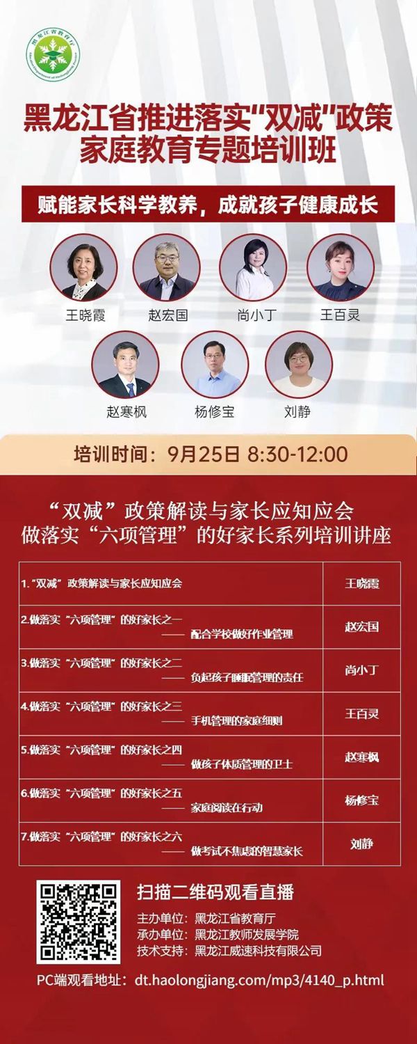 據(jù)了解,此次培訓(xùn)是《黑龍江省中小學(xué)“百萬家庭賦能”工程實(shí)施方案》重要組成部分,也是省教育廳踐行黨史學(xué)習(xí)教育“我為群眾辦實(shí)事”,解決群眾急難愁盼問題的具體舉措,由省教育廳主辦、黑龍江教師發(fā)展學(xué)院承辦,基礎(chǔ)教育處處長領(lǐng)銜六位家庭教育專家共同開講,時(shí)長三個(gè)半小時(shí),受到廣大家長的一致好評(píng),取得良好的社會(huì)反響,直播時(shí)瀏覽峰值達(dá)到210.7萬人次。培訓(xùn)內(nèi)容緊緊圍繞廣大家長們“雙減”形勢(shì)下的困惑,深入宣傳“雙減”政策和年初以來教育部相繼下發(fā)的關(guān)于手機(jī)、作業(yè)、睡眠、讀物、體質(zhì)、考試等“六項(xiàng)管理”文件內(nèi)容,分七個(gè)專題進(jìn)行深入細(xì)致的家庭教育指導(dǎo),有的放矢地解答家長“心中所疑”、化解家長“心中所急”,很多家長通過家庭學(xué)校群進(jìn)行交流,有的家長反饋道:“通過觀看直播我們家長深刻體會(huì)到一定要以身作則,在孩子面前少玩手機(jī),多陪孩子閱讀書籍,多讓孩子進(jìn)行戶外活動(dòng)?!庇械募议L則表示,聽了講座深刻理解了孩子成長的根基深植于家庭教育的道理,家庭教育才是孩子的起跑線,主動(dòng)地配合學(xué)校落實(shí)“雙減”政策,從做好“六項(xiàng)管理”入手科學(xué)優(yōu)化家庭教養(yǎng)方式,減少孩子的校外培訓(xùn)和作業(yè)負(fù)擔(dān),還給孩子一個(gè)幸福的童年,做一名智慧家長。