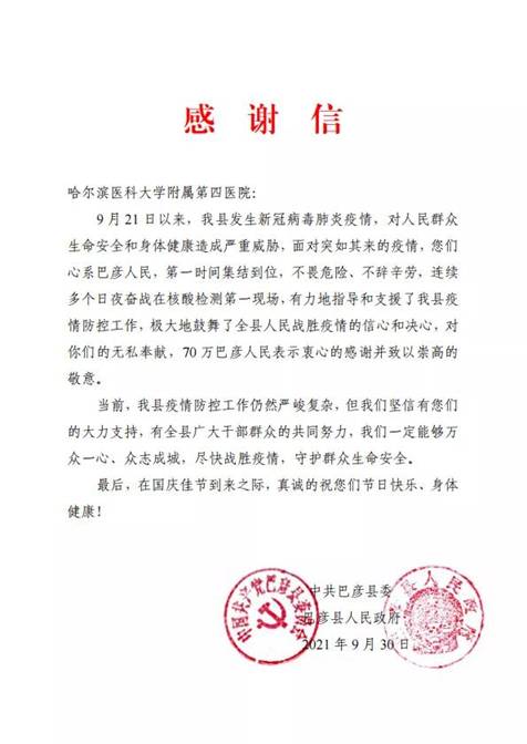 黑龍江經濟網訊(黑龍江日報全媒體見習記者董廣碩 商祺)近日,哈爾濱醫(yī)科大學附屬一院、二院、腫瘤醫(yī)院、四院分別收到巴彥縣委縣政府的感謝信,感謝他們“有力地指導和支援了我縣疫情防控工作,極大地鼓舞了全縣人民戰(zhàn)勝疫情的信心和決心?!?/span>