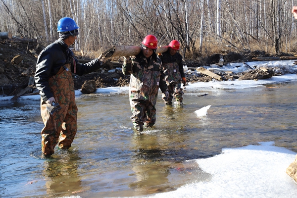 阿木爾林業(yè)局多種經(jīng)營公司職工涉水檢查新建橋梁安全系數(shù)。