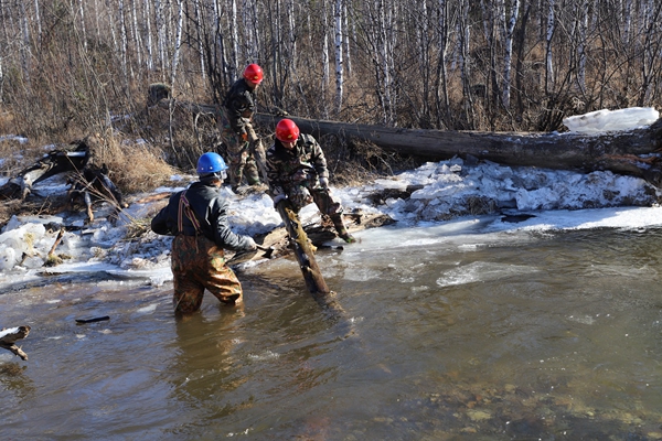 阿木爾林業(yè)局多種經(jīng)營公司職工清理水毀橋河道里的雜木。