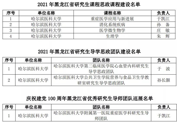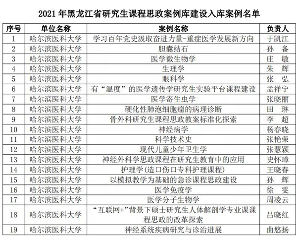 黑龍江經(jīng)濟(jì)網(wǎng)訊(黑龍江日?qǐng)?bào)全媒體見(jiàn)習(xí)記者董廣碩 商祺)為貫徹落實(shí)國(guó)家《關(guān)于全面落實(shí)研究生導(dǎo)師立德樹(shù)人職責(zé)的意見(jiàn)》《高等學(xué)校課程思政建設(shè)指導(dǎo)綱要》《關(guān)于加快新時(shí)代研究生教育改革發(fā)展的意見(jiàn)》精神,按照《關(guān)于加快新時(shí)代黑龍江省研究生教育改革發(fā)展的實(shí)施意見(jiàn)》要求,日前,經(jīng)全省研究生培養(yǎng)單位遴選推薦,黑龍江省研究生課程思政教育聯(lián)盟專(zhuān)家委員會(huì)評(píng)審,省學(xué)位委員會(huì)、省教育廳批準(zhǔn),哈爾濱醫(yī)科大學(xué)共有26個(gè)項(xiàng)目獲批省級(jí)立項(xiàng),其中研究生課程思政課程建設(shè)項(xiàng)目4個(gè)、研究生導(dǎo)學(xué)思政團(tuán)隊(duì)(導(dǎo)師)建設(shè)項(xiàng)目2個(gè)、研究生課程思政案例19個(gè),慶祝建黨100周年巡展優(yōu)秀研究生導(dǎo)師團(tuán)隊(duì)1支。