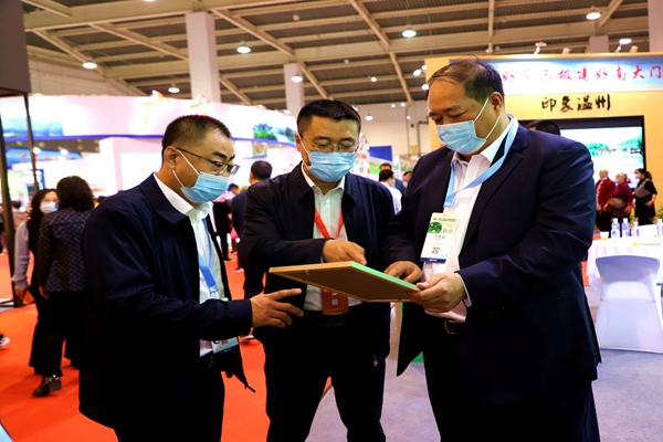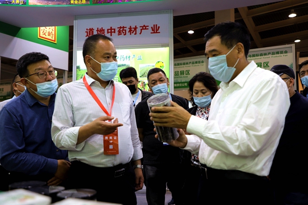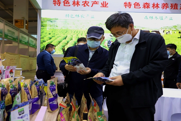 阿木爾林業(yè)局黨委書記胡守慶(右一)查看參展產(chǎn)品質量情況(王力/攝)