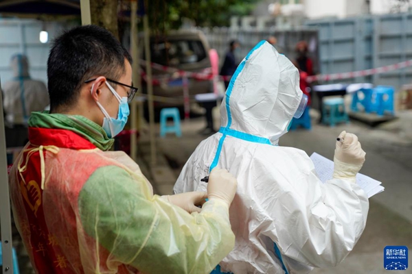 11月4日,在重慶九龍坡區(qū)九龍街道,青年志愿者相互幫助穿防護(hù)服。