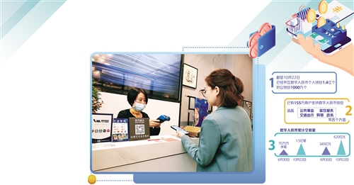 線下場景日益多元的同時(shí),數(shù)字人民幣交易場景也正在發(fā)力線上,形成了“線上+線下”并行推廣的格局?,F(xiàn)在,數(shù)字人民幣已經(jīng)可以在京東、美團(tuán)、滴滴等多個(gè)線上場景使用。截至10月22日,已有155萬商戶支持?jǐn)?shù)字人民幣錢包,涵蓋公共事業(yè)、餐飲服務(wù)、交通出行、購物和政務(wù)等各個(gè)方面。