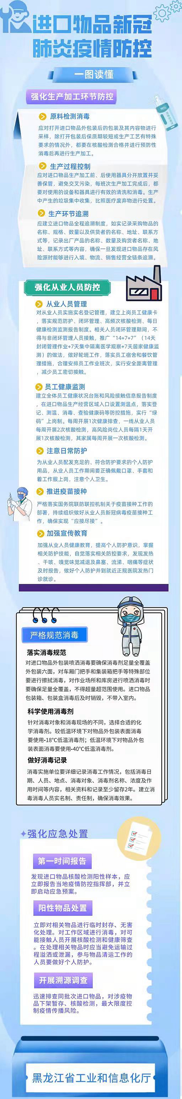 公開信表示,近期疫情反彈形勢嚴(yán)峻復(fù)雜,為確保工業(yè)企業(yè)不發(fā)生聚集性疫情,共同構(gòu)筑疫情防控堅(jiān)固防線,提示:涉及進(jìn)口物品加工、使用的工業(yè)企業(yè)要嚴(yán)格按照《黑龍江省進(jìn)口物品新冠肺炎疫情風(fēng)險(xiǎn)防控工作方案》落實(shí)各項(xiàng)防疫措施。一要強(qiáng)化生產(chǎn)加工環(huán)節(jié)的防控。生產(chǎn)前做好原料檢測消毒,生產(chǎn)中做好過程控制,設(shè)備和器具進(jìn)行有效的清洗和消毒避免交叉污染,產(chǎn)生的垃圾集中收集,比照醫(yī)療廢棄物進(jìn)行處置。建立進(jìn)口物品全程追溯制度,確保一旦發(fā)現(xiàn)進(jìn)口物品存在風(fēng)險(xiǎn)源時(shí)能夠進(jìn)行入境、物流、銷售經(jīng)營全鏈條追溯。二要強(qiáng)化從業(yè)人員防控。對員工實(shí)施實(shí)名登記管理,做好員工健康監(jiān)測和核酸檢測,合理安排作業(yè)班次,減少密切接觸。配發(fā)充足并符合防護(hù)要求的個(gè)人防護(hù)用品,加強(qiáng)員工健康教育,提高個(gè)人防護(hù)意識。嚴(yán)格落實(shí)當(dāng)?shù)仃P(guān)于疫苗接種工作的部署,持續(xù)組織做好員工新冠病毒疫苗接種工作,確保實(shí)現(xiàn)“應(yīng)接盡接”。三要嚴(yán)格規(guī)范消毒。對進(jìn)口物品外包裝、加工場所、車廂門把手和集裝箱把手等要嚴(yán)格按照規(guī)范消毒,消毒時(shí)要確保足量全覆蓋并針對消毒對象和消毒現(xiàn)場的不同選擇合適的化學(xué)消毒劑。詳細(xì)記錄消毒工作情況,建立消毒人員實(shí)名制、責(zé)任制,確保消毒效果。四要強(qiáng)化應(yīng)急處置。發(fā)現(xiàn)進(jìn)口物品核酸監(jiān)測陽性樣本,應(yīng)立即報(bào)告當(dāng)?shù)匾咔榉揽刂笓]部,并同步啟動應(yīng)急預(yù)案。對相關(guān)物品進(jìn)行臨時(shí)封存、無害化處理,對工作區(qū)域進(jìn)行消毒,對可能接觸的人員開展核酸檢測和健康篩查。迅速排查同批次進(jìn)口物品,最大限度控制疫情傳播風(fēng)險(xiǎn)。