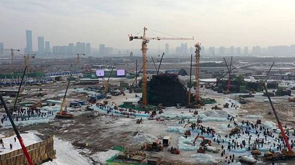 記者在哈爾濱冰雪大世界園區(qū)建設(shè)現(xiàn)場看到,工人們有序地忙碌著,塔吊、叉車、鏟車等各種機(jī)械設(shè)備在緊張作業(yè),工人切冰、鏟冰的聲音與作業(yè)機(jī)械的轟鳴聲,在園區(qū)內(nèi)交織成一首“建設(shè)交響樂”。