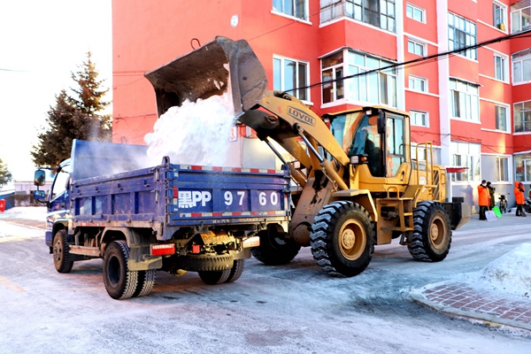 鑒于此,林業(yè)局環(huán)衛(wèi)隊(duì)組織10多名環(huán)衛(wèi)工,出動兩臺翻斗車、一臺裝載機(jī),對28棟居民樓房前的硬化地面積雪進(jìn)行“大掃除”,擴(kuò)大步行道面積,方便居民出行。