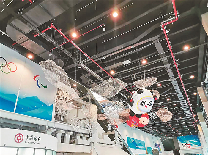 進(jìn)入主媒體中心一層,懸在半空中碩大的冰墩墩和雪容融頗為吸睛,很多媒體記者爭(zhēng)相與其合影。不遠(yuǎn)處,一塊巨大電子高清屏幕,正播放著短道速滑世界杯的比賽視頻,畫面清晰得如同親臨賽場(chǎng)。