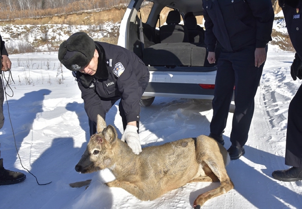 2月2日,正值大年初二,塔河縣公安局森保大隊民警接到鎮(zhèn)內(nèi)群眾的報警求助電話,稱一只疑似狍子的野生動物誤闖進(jìn)自己家倉庫院內(nèi),民警立刻趕往現(xiàn)場。到達(dá)現(xiàn)場后,民警判斷這是一只成年狍子。報警群眾稱和親戚費(fèi)了不少勁才把這只誤闖居民區(qū)的袍子抓住,為了防止其亂跑受到意外傷害專門用繩子將其腿系住,然后立刻報了警。經(jīng)過仔細(xì)查驗,森保民警確認(rèn)袍子沒有明顯傷病。在精心照顧和觀察了兩個小時后,看到其行動能力正常,精神狀態(tài)良好,符合放生條件后,森保大隊民警和報警群眾將這只狍子放歸了大自然?!鞍菽辍贬笞釉谕瓿闪俗约旱男脑负笤谌藗兊哪克拖職g快地回歸了山林。