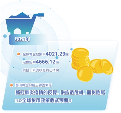 方正中期期貨有限公司貴金屬研究員史家亮認(rèn)為,2021年,全球黃金總需求4021.29噸,總供給為4666.12噸,供過于求的狀態(tài)仍在持續(xù)。不過,黃金價格并沒有持續(xù)大幅回落,主因在于黃金的商品屬性對價格的影響仍在弱化,黃金的債券屬性和貨幣屬性是黃金價格走勢的核心影響因素,而這又與美聯(lián)儲貨幣政策走勢密切相關(guān)。