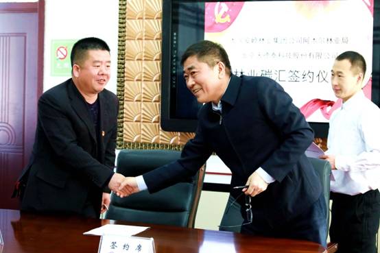 阿木爾林業(yè)局副局長李玉峰與北京天得泰科技股份有限公司副董事長、專家委員會主席孫樹鎖相互握手,慶賀簽約文本,開啟碳匯經濟產業(yè)發(fā)展之路(王力 攝)