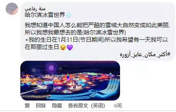 開(kāi)羅中國(guó)文化中心臉書主頁(yè)超級(jí)粉絲艾曼·索比、曼娜·伊薩姆和羅飛三位網(wǎng)友獲得了優(yōu)秀評(píng)論獎(jiǎng)。艾曼·索比在留言中提出想去黑龍江大慶泡雪地溫泉;曼娜·伊薩姆在評(píng)論里說(shuō)她想去哈爾濱極地公園游玩,想去牡丹江鏡泊湖的冰瀑跳水,想去吉林的查干湖看看;羅飛表示想到哈爾濱冰雪大世界去過(guò)生日。眾多網(wǎng)友也紛紛曬出了自己最想去的地方,新聞與媒體從業(yè)者加達(dá)·阿里想先去遼寧的滑雪場(chǎng),然后再去采摘丹東的草莓;來(lái)自明亞省的緒瑪·穆斯塔法表示想去內(nèi)蒙古東方冰雪小城阿爾山旅游;畢業(yè)于蘇哈格大學(xué)的薩蒙·瓦赫想去北京看奧林匹克塔等。網(wǎng)友們各抒己見(jiàn),暢想去中國(guó)的夢(mèng)幻旅程。