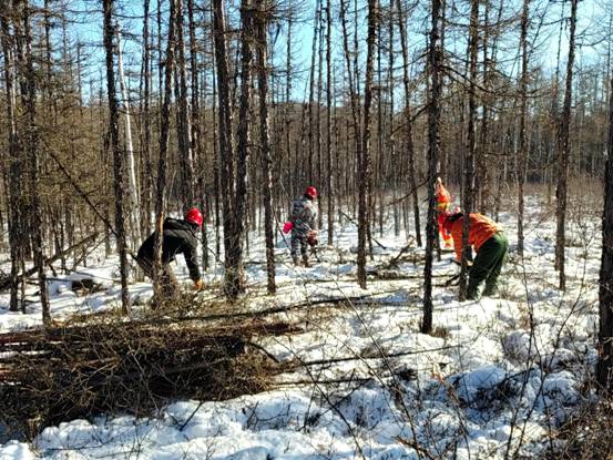 圖強(qiáng)林業(yè)局營林工人們在林間清理撫育枝丫(趙明 攝)