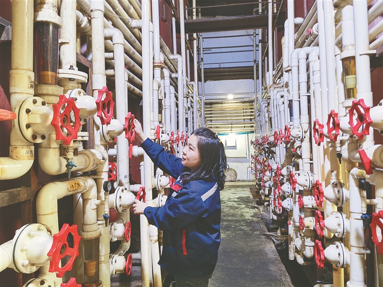 工人對糖液進(jìn)行凈化提純。