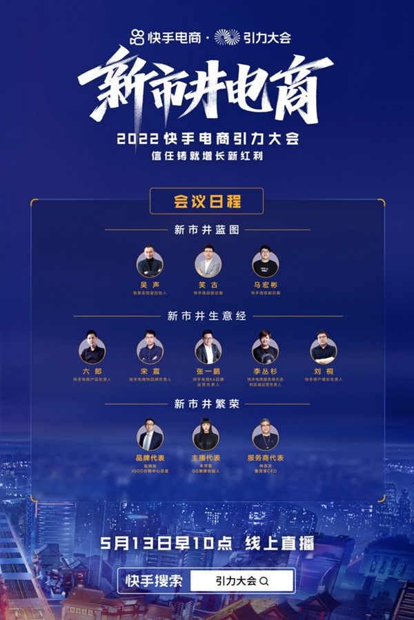 2022年快手電商引力大會于5月13日上午10點在北京舉行。2022快手電商引力大會議程包括新市井藍圖、新市井生意經、新市井繁榮三大篇章。