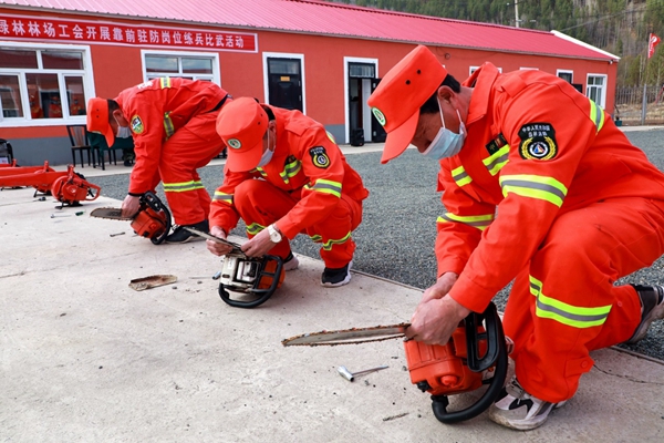 阿木爾林業(yè)局綠林林場(chǎng)專(zhuān)業(yè)撲火隊(duì)員在進(jìn)行風(fēng)力滅火機(jī)、油鋸的拆裝維修使用比賽(王力 攝)
