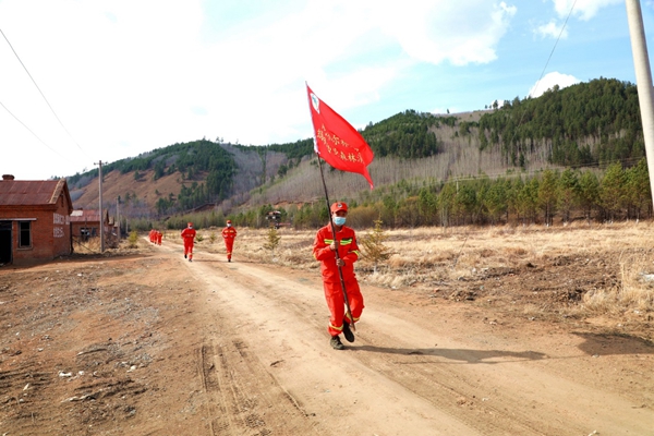 阿木爾林業(yè)局綠林林場(chǎng)專(zhuān)業(yè)撲火隊(duì)伍進(jìn)行輕裝快速行軍兩公里比賽(王力 攝)