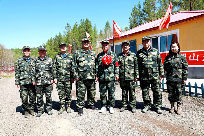 阿木爾林業(yè)局、依東林場領(lǐng)導干部與即將退休的共產(chǎn)黨員、管護員滿德江合影。(王力 攝)