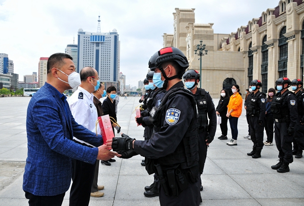 公益活動(dòng)首批慰問(wèn)對(duì)象是剛從抗疫一線歸來(lái)的哈爾濱市公安局巡特警支隊(duì)隊(duì)員。本次疫情期間,他們馳援五常市拉林鎮(zhèn)、哈爾濱市平房區(qū)和賓縣,先后核查車輛3700余臺(tái),幫助群眾1100多人,為群眾配送餐食10萬(wàn)余份、飲用水20余萬(wàn)瓶、防疫物資9000余件,用血肉身軀筑起了抗擊疫情的鋼鐵長(zhǎng)城,詮釋了“疫情當(dāng)前,特警在先”的使命擔(dān)當(dāng)?!案兄x黑龍江日?qǐng)?bào)報(bào)業(yè)集團(tuán)和愛(ài)心企業(yè)送來(lái)健康產(chǎn)品。今后我們會(huì)一如繼往做好本職工作,哪里需要哪里上,當(dāng)好人民的忠誠(chéng)衛(wèi)士?!苯舆^(guò)“小綠君”,哈爾濱市公安局巡特警支隊(duì)特警一大隊(duì)二中隊(duì)教導(dǎo)員劉甲洲一臉幸福。