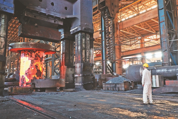 在中國(guó)一重集團(tuán)有限公司,工人在車(chē)間內(nèi)忙碌(5月19日攝)。 新華社記者 唐鐵富攝