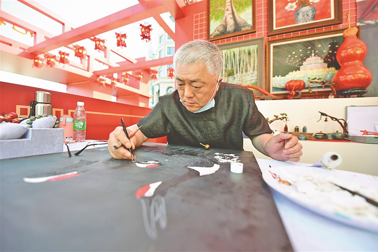 金漆鑲嵌制作技藝展區(qū),傳承人現(xiàn)場展示技藝。黑龍江日報全媒體記者 荊天旭攝