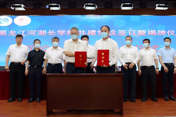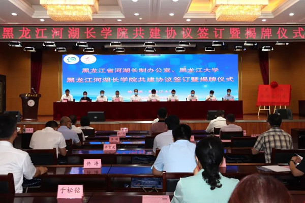 儀式上,省水利廳黨組書記、廳長、省河湖長制辦公室常務(wù)副主任侯百君和黑龍江大學(xué)校長付宏剛簽訂了共建協(xié)議,與黑龍江大學(xué)黨委書記王永清共同為黑龍江河湖長學(xué)院揭牌。