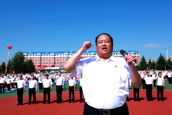 青年黨員母立巖手舉黨旗健步跑向藍(lán)莓廣場(chǎng)主席臺(tái),把黨旗交到了林業(yè)局黨委書記胡守慶手中,胡守慶揮舞黨旗,臺(tái)下黨員齊聲說(shuō)道:“不忘初心、牢記使命”。