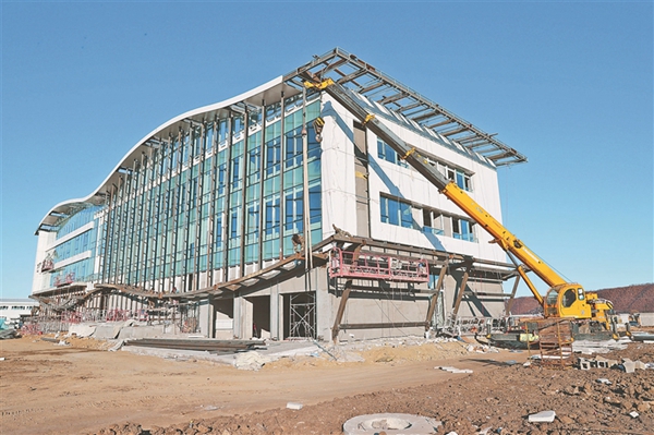 臨近立冬,黑河市氣溫已降至零下。在黑河市愛輝區(qū)上馬場鎮(zhèn),黑河寒區(qū)試車高新技術產業(yè)園項目仍在緊張建設。起重機吊起外墻造型鋼架,工人們在腳手架上拿著焊槍緊張作業(yè)。