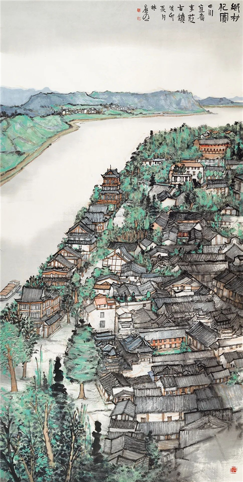 林容生 鄉(xiāng)村紀實·宜賓李莊古鎮(zhèn) 234cm×123cm 國畫