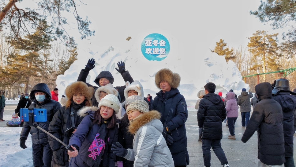 游客在哈爾濱松花江冰雪嘉年華園區(qū)大門前合影