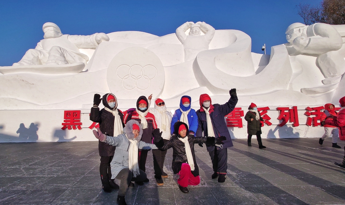 游客在太陽島雪博會《逐夢亞冬》雪塑前合影留念
