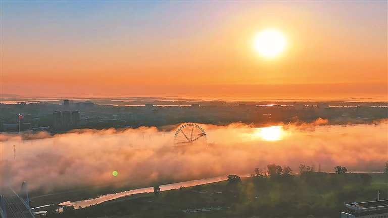 本報(bào)4日訊(關(guān)桐 楊啟坤 記者 潘宏宇)4日清晨,在黑河市愛(ài)輝區(qū),中俄界江黑龍江上橙光氤氳,霧氣繚繞,如夢(mèng)似幻,宛若仙境。