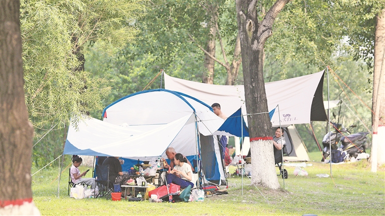 各個景區(qū)內(nèi),游客們撐起太陽傘,戴上遮陽帽,以抵御紫外線的照射。松花江畔的幾處浴場,人頭攢動,家長帶著孩子在這里戲水納涼。江邊的綠蔭里,滿是露營的帳篷,市民吃著冰西瓜、喝著涼啤酒,愜意地避暑。本報記者 張澍攝