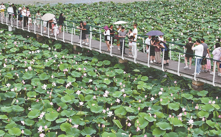 近日,哈爾濱文化中心濕地公園內(nèi)荷花綻放,吐露出它們的花苞,風(fēng)過荷塘帶來陣陣荷香,荷葉上的露水滴落,發(fā)出清脆的聲音,整個(gè)荷花池塘展現(xiàn)出夏天獨(dú)有的生機(jī)。這滿塘的荷花爭奇斗艷,吸引眾多游客、市民前來賞花打卡。數(shù)條觀光棧道延伸至濕地深處,人們走在棧道上,近距離觀看野鴨子、白骨頂雞等野生鳥類,與蘆葦、荷花等水生植物親密接觸。