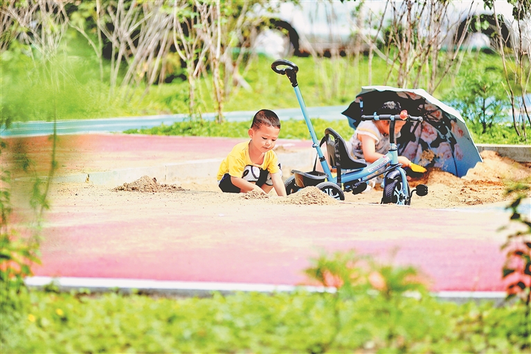 這處“口袋公園”占地面積數(shù)百平方米,里面有供人們散步聊天的休閑區(qū),有供孩子們玩樂的“微型沙灘”,花草樹木生長茂盛,景色很美。