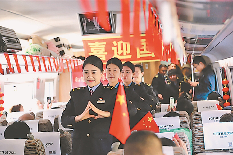 G774次列車乘務(wù)人員與乘客一起聯(lián)歡。本報記者 王迪攝