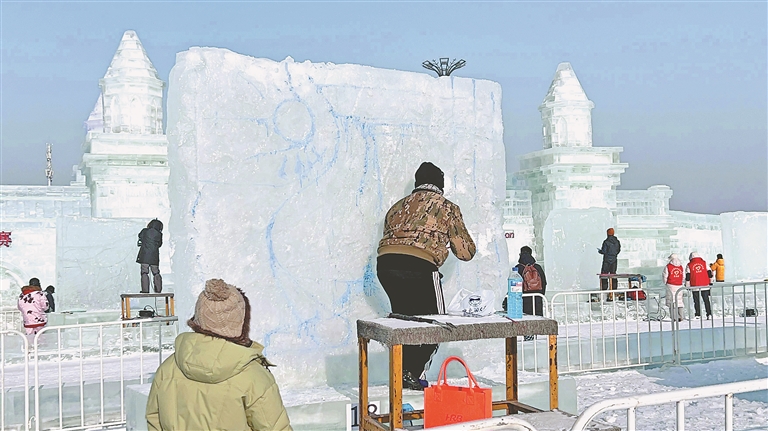 據(jù)了解,本屆冰雕比賽歷時(shí)3天,所有參賽作品將于1月4日雕刻結(jié)束,與游客見(jiàn)面。本報(bào)記者 馬智博攝