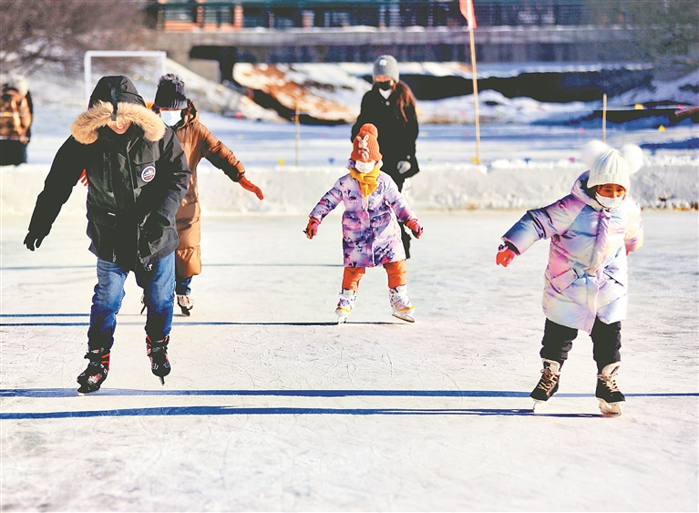 近日,哈爾濱市道里區(qū)群力體育公園公益冰場內(nèi),許多人在練習滑冰。