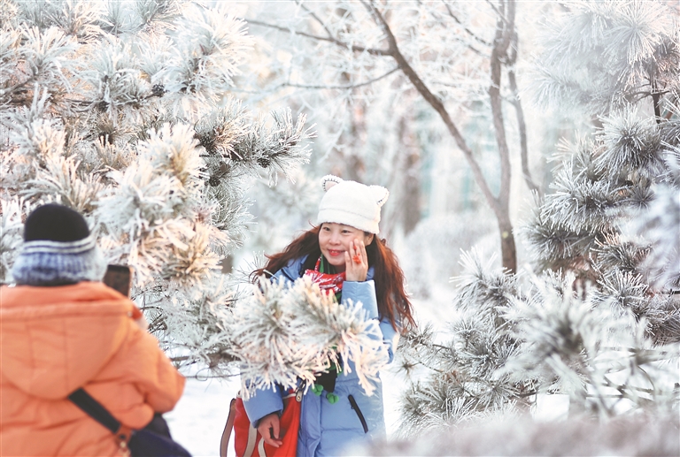 在松花江畔,一排排樹木都變成了白色,枝頭的冰晶反射著太陽的光芒,景色迷人,走入其中,仿佛置身于童話世界。游客們一邊觀賞霧凇美景,一邊用手機(jī)拍下精彩瞬間。