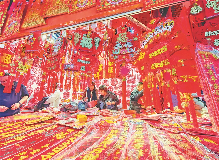 春節(jié)臨近,哈爾濱市道里區(qū)一處批發(fā)市場(chǎng)內(nèi),市民們正在購(gòu)買(mǎi)各種節(jié)日飾品,用來(lái)裝點(diǎn)家居,迎接新春佳節(jié)的到來(lái)。蛇年主題的燈籠、對(duì)聯(lián)、福字等擺滿了柜臺(tái),紅紅火火,喜慶氣氛濃厚。人們臉上都洋溢著幸福的笑容,一邊逛一邊買(mǎi),個(gè)個(gè)滿載而歸。